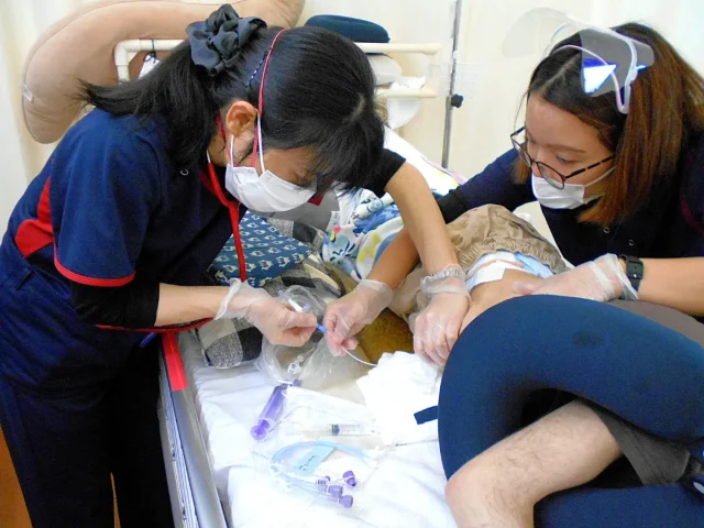 利用者の状態に応じて必要な医療処置を行います。胃ろうや気管カニューレの交換、ITBリフィル、点滴や採血などを実施します。